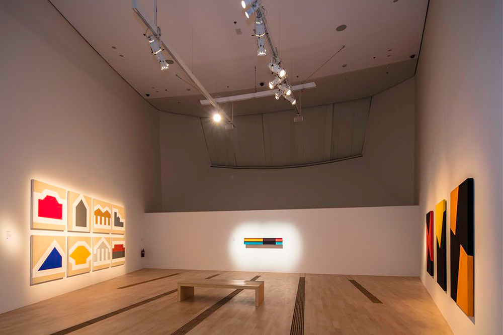 Chen Shiau-Peng (left), Donald Judd (middle), Carmen Herrera (right) and Jeremy Sharma (sound) showing in the Color and Form gallery in Minimalism: Space. Light. Object. at ArtScience Museum, Singapore.